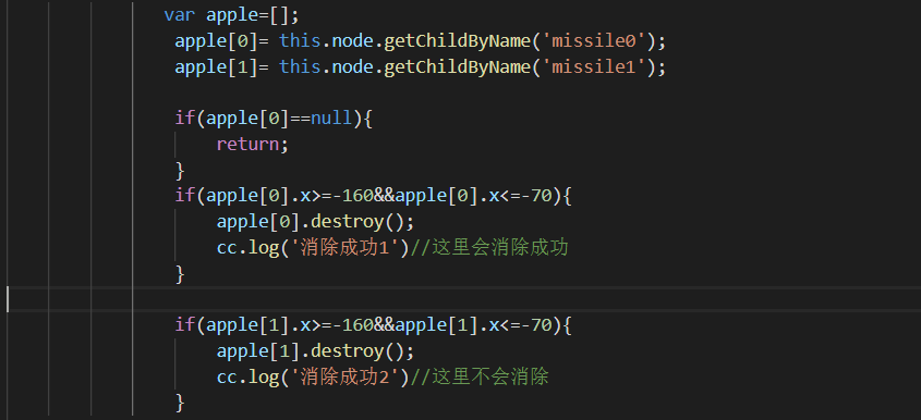 老哥们,我设置两个物体一前一后移动,当移动到一定位置的时候我按下按钮,判断他们的位置是否到达了,到达位置就消除节点,但是为啥他只会消除第一个节点,不会消除第二个节