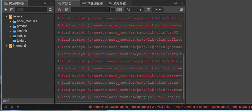 后面我想着把库文件node_modules移到assets里试下,直接报一堆load scripts failed… 如下图