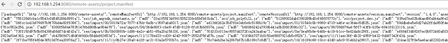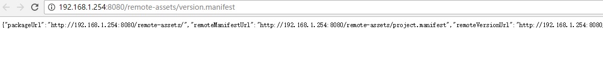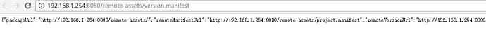 {“packageUrl”:“http://192.168.1.254:8080/remote-assets/",“remoteManifestUrl”:“http://192.168.1.254:8080/remote-assets/project.manifest”,“remoteVersionUrl”:“http://192.168.1.254:8080/remote-assets/version.manifest”,“version”:"1.0.0”}