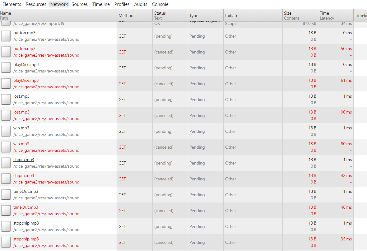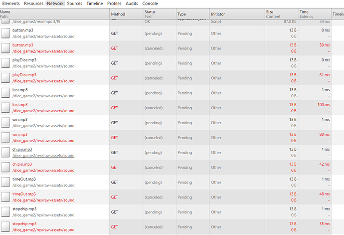 (2)cc.AudioEngine.playEffect播放音效,在不支持webAudio浏览器上声音加载方式回退到Dom方式,在浏览器network上观察声音都加载失败,造成声音卡顿严重,基本上不具有可播放性。