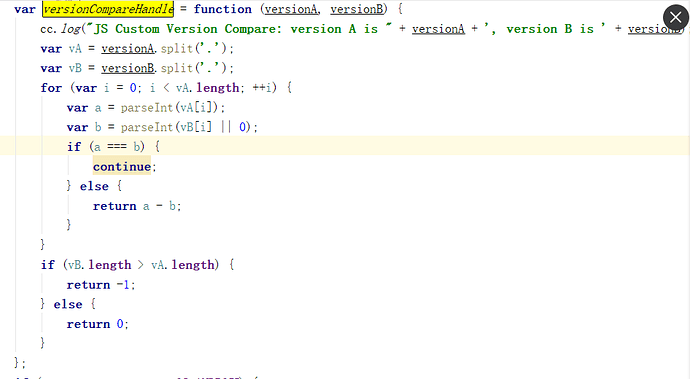 应该是你的 versionCompareHandle 生命周期问题,这个函数的定义是一个局部变量,在文件闭包执行完毕之后就会被释放,所以你应该把他的引用保存在其他对象上。