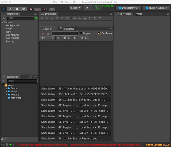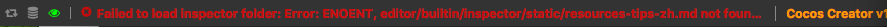 2017-12-14T03:17:39.627Z - error: Failed to load inspector folder: Error: ENOENT, editor/builtin/inspector/static/resources-tips-zh.md not found in /Applications/CocosCreator.app/Contents/Resources/app.asar at notFoundError (ELECTRON_ASAR.js:133:19) at Object.fs.readFileSync (ELECTRON_ASAR.js:536:9) at CcMarkdownPreview._highlightCode (packages://inspector/share/markdown-preview.js:1:447) at CcMarkdownPreview._highlightCode (app://bower_components/vue/dist/vue.js:220:72) at CcMarkdownPreview._updateText (packages://inspector/share/markdown-preview.js:1:281) at CcMarkdownPreview._updateText (app://bower_components/vue/dist/vue.js:220:72) at CcMarkdownPreview.compiled (packages://inspector/share/markdown-preview.js:1:204) at CcMarkdownPreview.Vue._callHook (app://bower_components/vue/dist/vue.js:8396:21) at CcMarkdownPreview.Vue._compile (app://bower_components/vue/dist/vue.js:8789:10) at CcMarkdownPreview.Vue.$mount (app://bower_components/vue/dist/vue.js:9607:10) at _loadInspector (/Applications/CocosCreator.app/Contents/Resources/app.asar/editor/builtin/inspector/panel/index.js:1:6766) at Editor.import.then.catch.e (/Applications/CocosCreator.app/Contents/Resources/app.asar/editor/builtin/inspector/panel/index.js:1:7878) at <anonymous> 2017-12-14T03:59:01.214Z - error: Failed to load inspector folder: Error: ENOENT, editor/builtin/inspector/static/resources-tips-zh.md not found in /Applications/CocosCreator.app/Contents/Resources/app.asar at notFoundError (ELECTRON_ASAR.js:133:19) at Object.fs.readFileSync (ELECTRON_ASAR.js:536:9) at CcMarkdownPreview._highlightCode (packages://inspector/share/markdown-preview.js:1:447) at CcMarkdownPreview._highlightCode (app://bower_components/vue/dist/vue.js:220:72) at CcMarkdownPreview._updateText (packages://inspector/share/markdown-preview.js:1:281) at CcMarkdownPreview._updateText (app://bower_components/vue/dist/vue.js:220:72) at CcMarkdownPreview.compiled (packages://inspector/share/markdown-preview.js:1:204) at CcMarkdownPreview.Vue._callHook (app://bower_components/vue/dist/vue.js:8396:21) at CcMarkdownPreview.Vue._compile (app://bower_components/vue/dist/vue.js:8789:10) at CcMarkdownPreview.Vue.$mount (app://bower_components/vue/dist/vue.js:9607:10) at _loadInspector (/Applications/CocosCreator.app/Contents/Resources/app.asar/editor/builtin/inspector/panel/index.js:1:6766) at Editor.import.then.catch.e (/Applications/CocosCreator.app/Contents/Resources/app.asar/editor/builtin/inspector/panel/index.js:1:7878) at <anonymous>