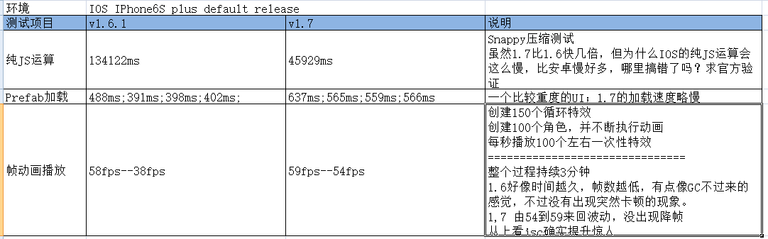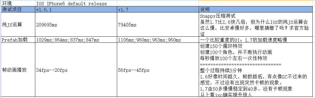从上面看V8的JavaScriptCore性能仍然比SpiderMonkey的快一些,而动画播放的提升就非常大了,1.7没出现卡顿的现象,且帧率更加高和稳定。