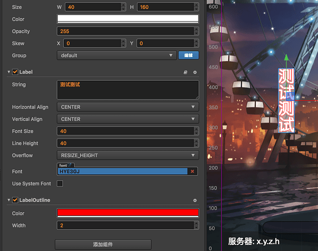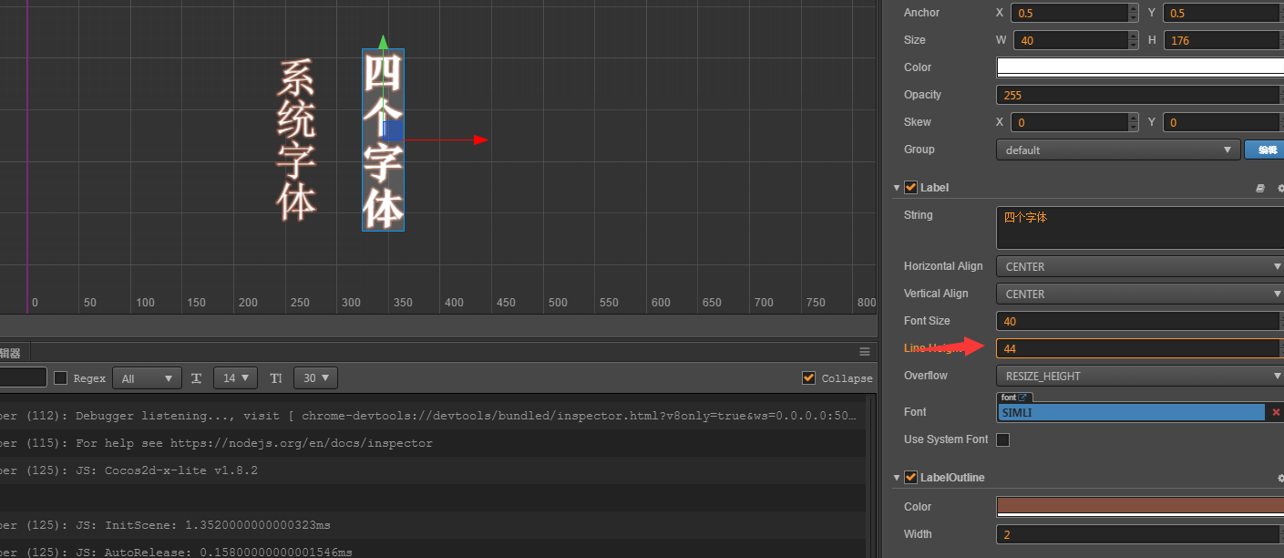 。这个间距明显被拉大了。拉大的原因我一开始推测觉得是label outLine加了加了两像素导致的,所以我在编译其中lineHeight设置为44,上下两个字加2,编译器中如下:
