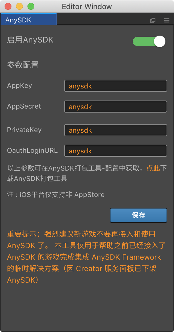 为了避免误导新的用户继续使用 AnySDK ,因此我们不得不从 Creator 中下架 AnySDK。