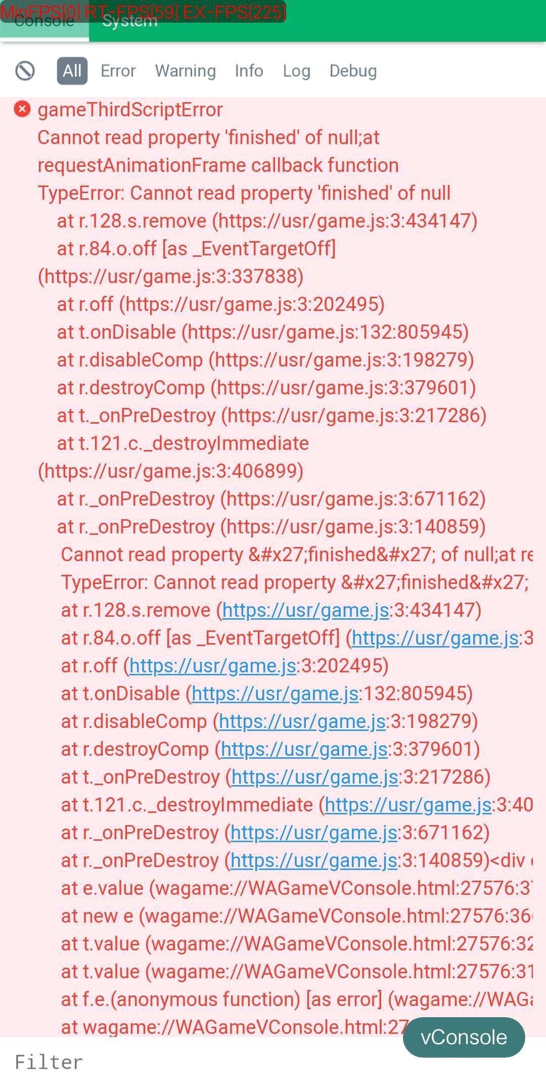 报错如图,经常发生在游戏切到微信聊天,然后又切回来,切回来后网络重连,重新请求了协议,并没有加载场景,各种动画监听finished的地方我都加了空值判断,但是还是会发生报错