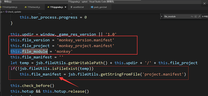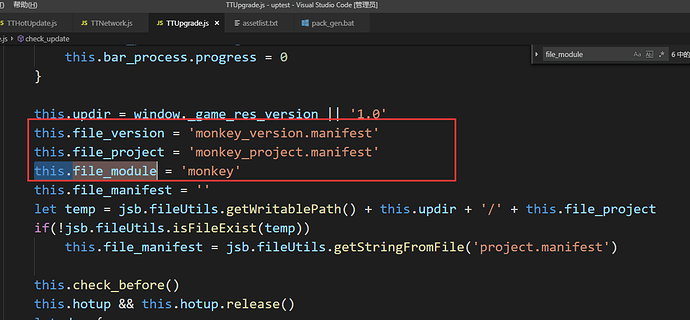 大佬求教,我尝试修改了TTUppgrade.js中check_update()里面的this.file_version,this.file_project,this.file_module等参数,更新时也从服务器正确下载到了monkey_project.manifest,但是更新会把整个项目都更新到了,无论是hall还是fish。