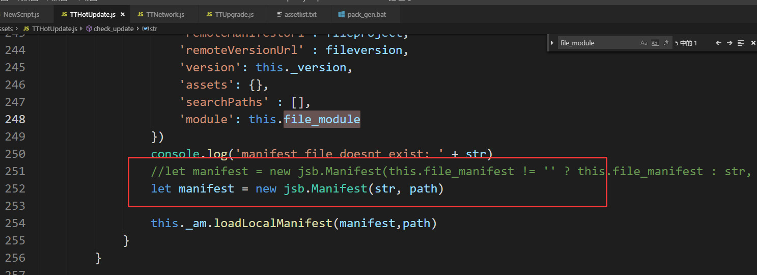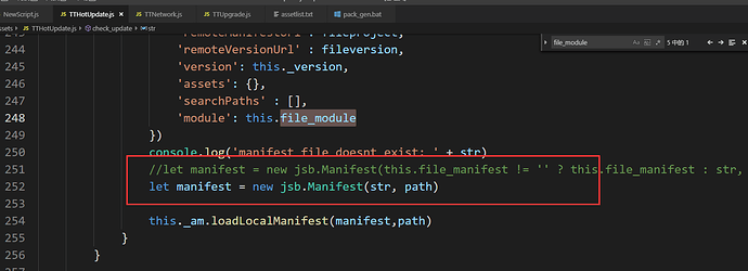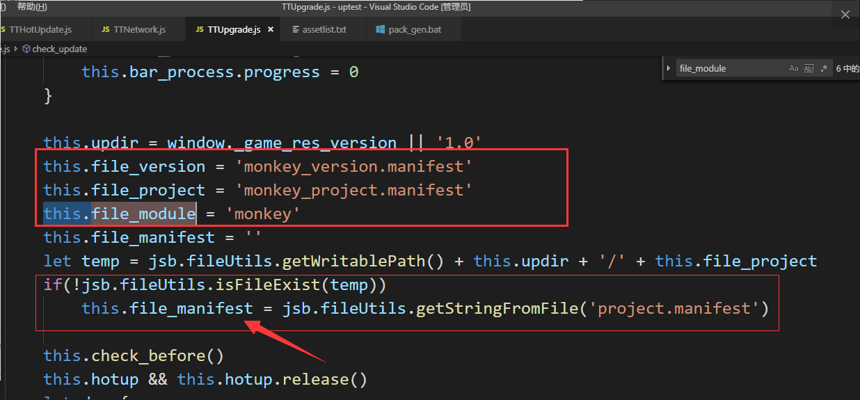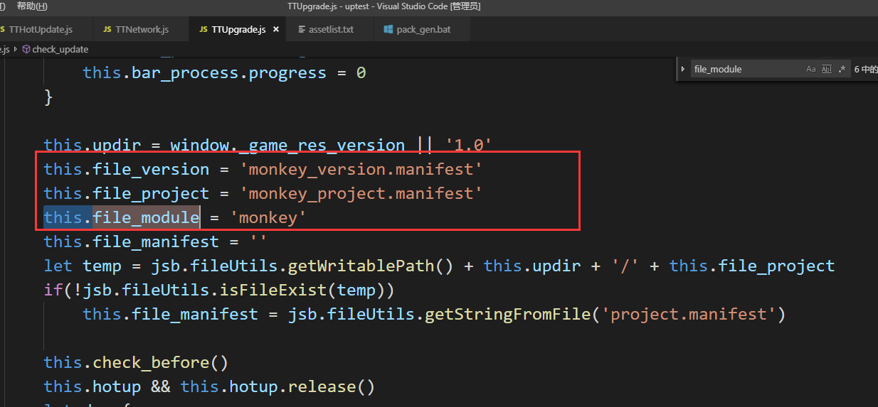 一般分包的话,你的包体内只需要包含hall_project.manifest的资源,更新时需要处理file_module字段,填写你要更新的模块。 - 第12行的版本号其实是为了兼容单包而做的,这个demo里我的this.file_module = ‘’,没有做分包处理,生成的project.manifest用到了这个版本号。如果你是做分包,可以忽略这个。