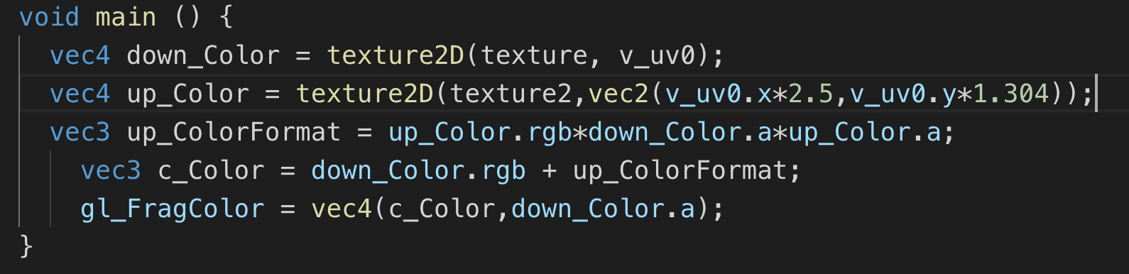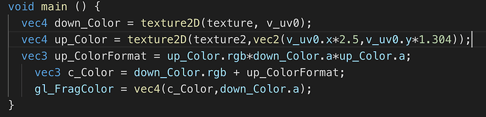 问题:上层图片在混合的时候被拉伸了,原本底图的分辨率是1280665,混合图片的分辨率为512512,但是在混合之后,混合图片就被拉伸到和底图一致了,通过修改纹理坐标点的倍率可以恢复拉伸,代码如下