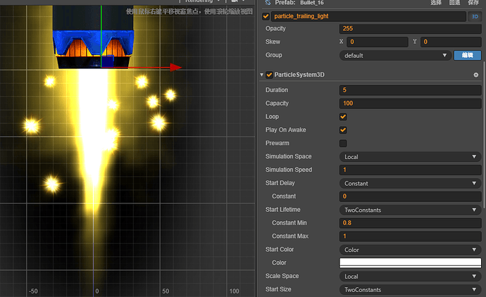 Creator2.3.3ParticleSystem3D粒子不跟随父节点旋转问题 粒子坐标系已设置局部坐标 部分3D粒子挂载在3D模型弹头父节点下不随弹头旋转而旋转 如图