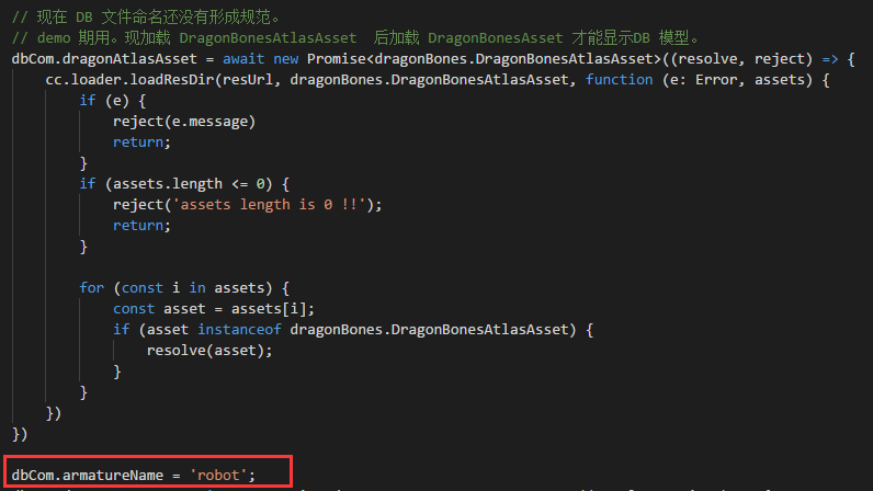 3.在加载 dragonBones.DragonBonesAsse 资源的时候,要手动给 armatureName 命名。也就是第二步里面的名字。robot。