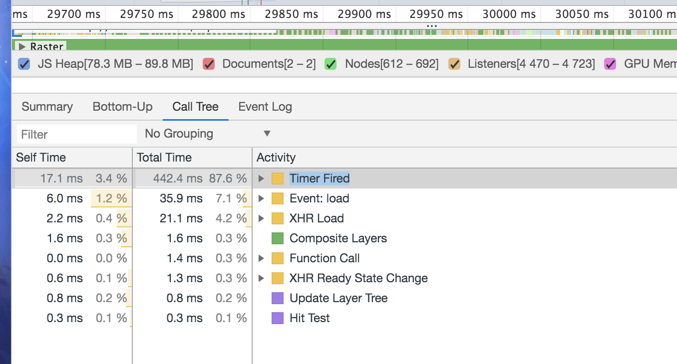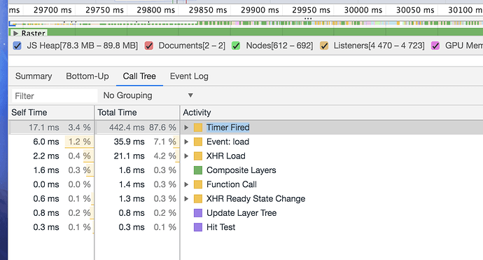 我用谷歌浏览器调试,从login场景 跳转到game,预加载过了,过来以后fps就3-4过一会才好。调试call tree栏一直显示Timer Fired(计时器触发)占用高。(就算fps稳定了,这个Timer Fired还是挺高的)