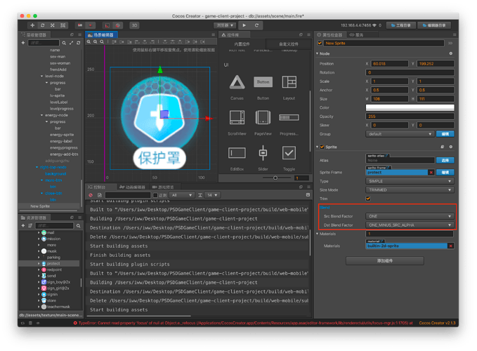 ·2 将这个图片资源生成为 Sprite 添加到 Canvas 上,在 Sprite 上,将 Blend 下的 Src Blend Factor 修改为 ONE, Dst Blend Factor 修改为 ONE_MINUS_SRC_ALPHA;