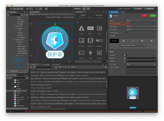 ·1 添加一个带有 alpha 通道的 PNG 图片资源到项目中,并且将图片资源的 Permultiply Alpha 勾选上;