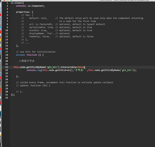 使用 this.node.getChildByName(‘gk1_btn’).getComponent(cc.Button).interactable = false;
