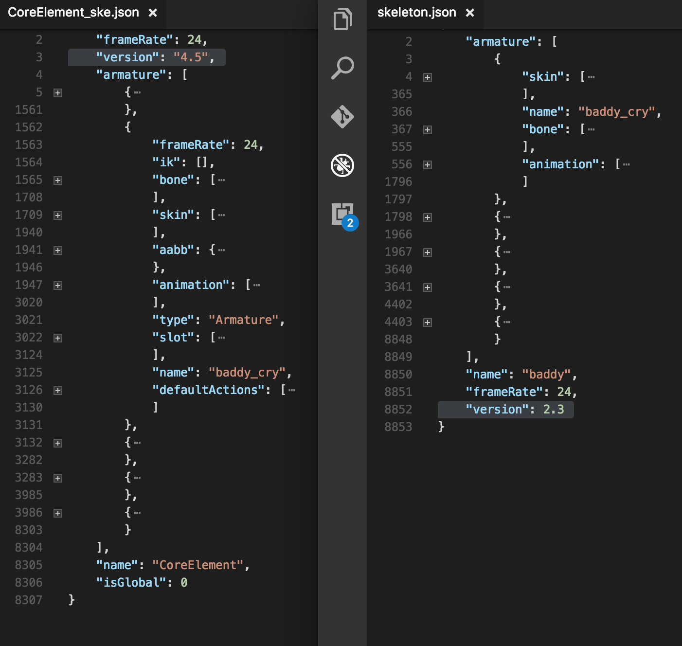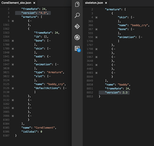 同一骨骼动画存储为两个不同版本,其json文件的结构是不同的,如下图:
