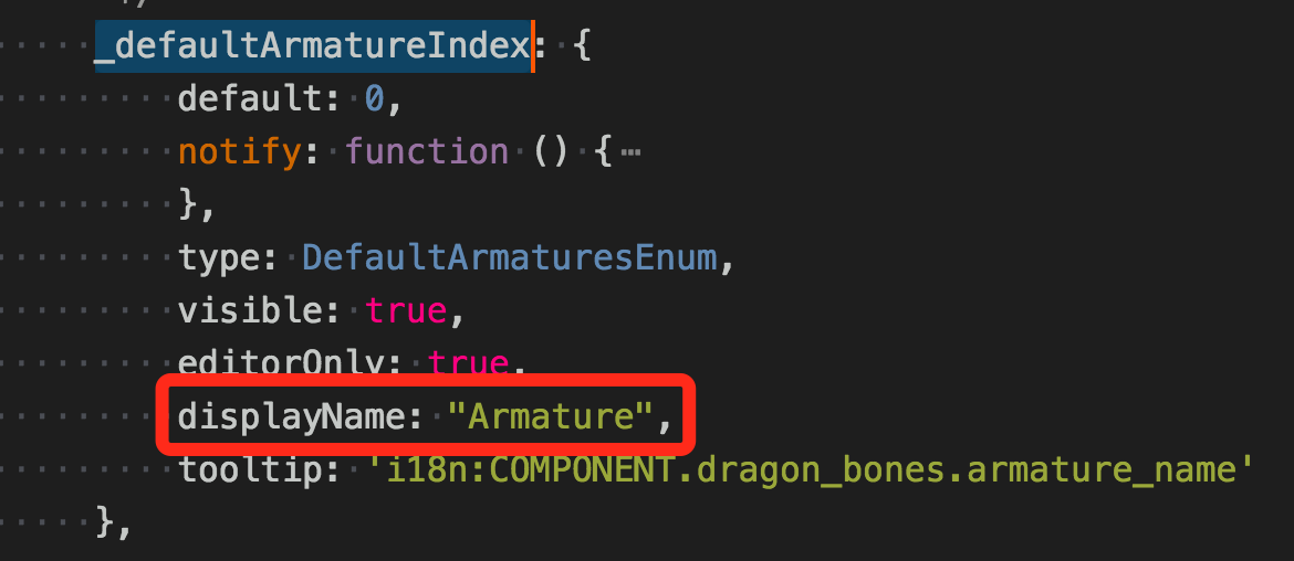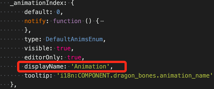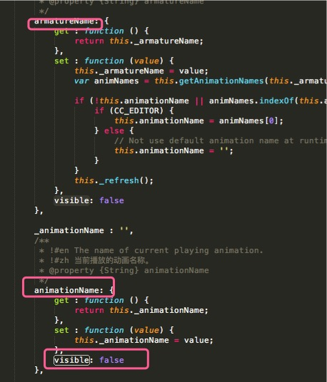 因为在编辑器中要做下拉列表来选择,所以,还有另外两个属性 _defaultArmatureIndex 和 _animationIndex 用于编辑器的显示: