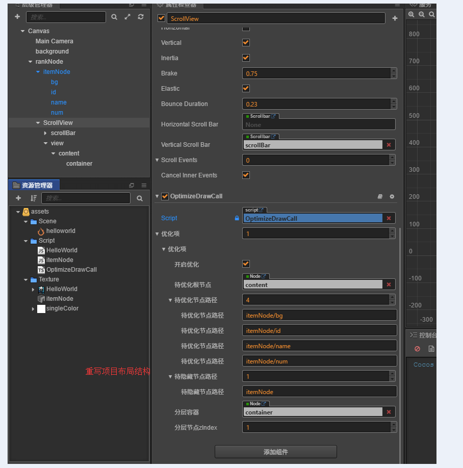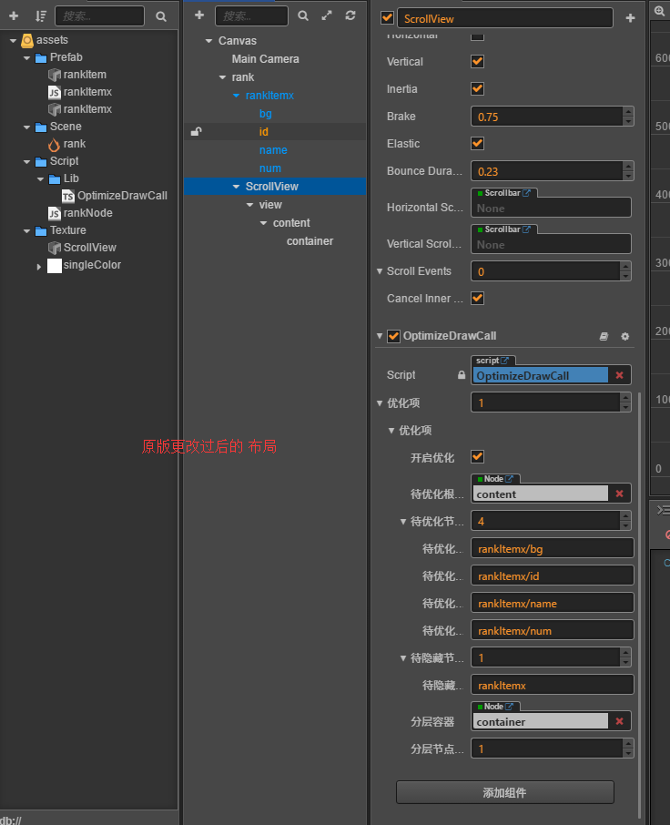 你可以决定container的层级。。。 想让优化节点在哪层就可以在哪层。。 你可以打开例子,试试看~