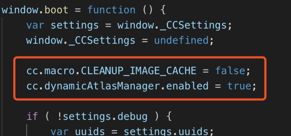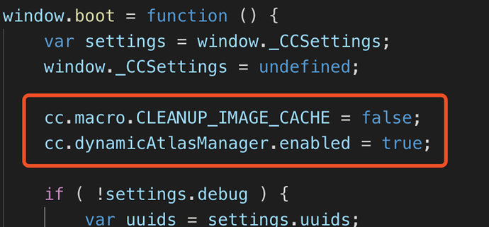 2.开启dynamicAtlas功能,开启这个功能你可以在main.js中的window.boot()方法内加入下面的两行代码即可: