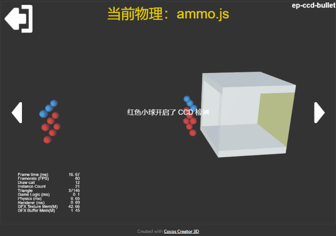 考虑到很多用户需求子弹的物理特性,希望刚体速度过快时不会发生穿越现象。通过此功能相应的测试例,可以找到开启子弹特性的相应的办法,但遗憾的是仅有bullet物理支持。 -