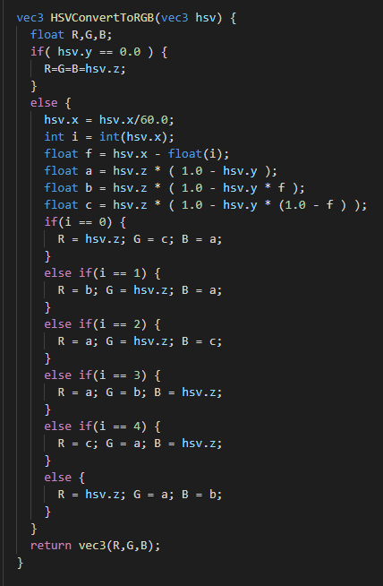 在HairColor.effect中新增rgb转hsv颜色值的函数,以及hsv颜色值转rgb的函数,从而实现在脚本中动态向effect中传入hsv值,修改材质颜色的功能。