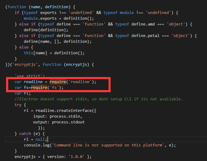 现在可以了。我把encryptjs.js文件里所有使用readline和fs的代码都注掉了。谢谢。