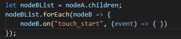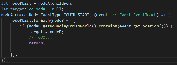 结点A中有100个子结点B,我给A.on(“touch_start”,(event)=>{});添加事件,通过event.target 获取子结点B,结果不行。