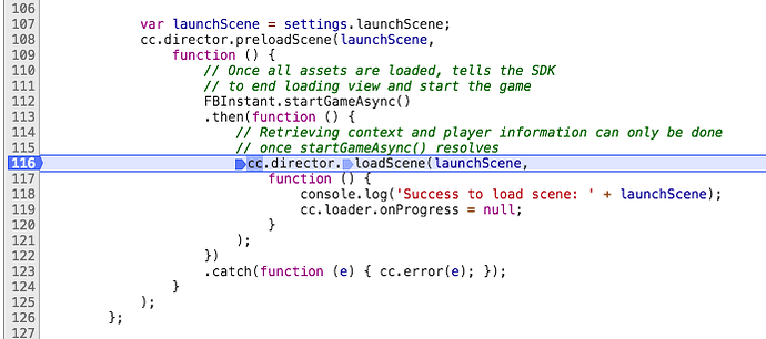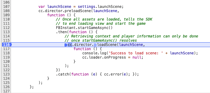 cc.director.loadScene()就是加载场景的,参数launchScene就是你设置的主界面(一进游戏就显示的场景),FBInstant.startGameAsync()是通知facebook游戏开始,转圈进度条也随着消失。