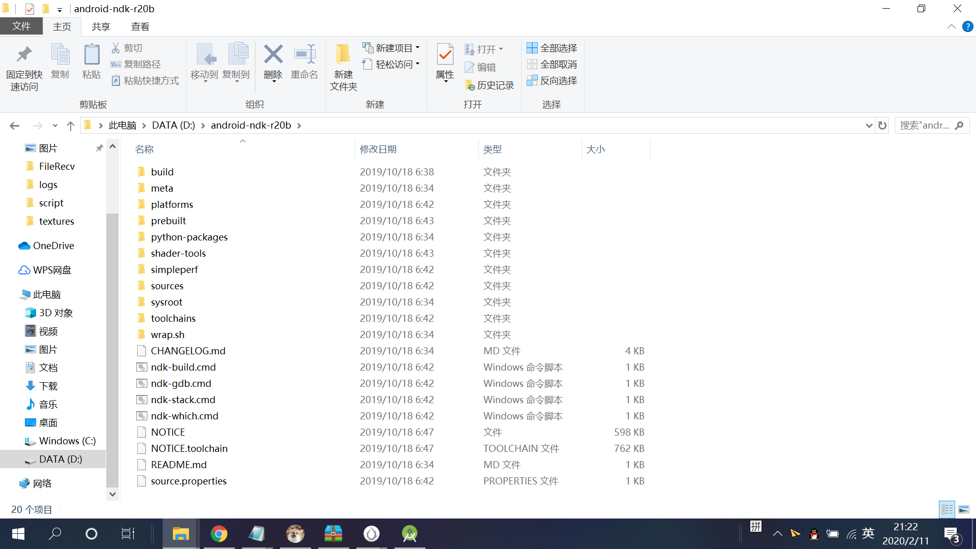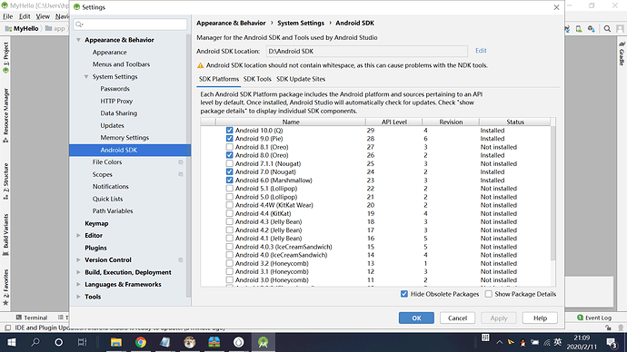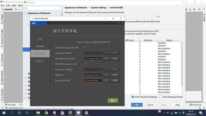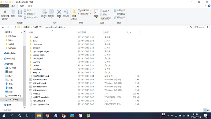NDK:一开始用的Android Studio里面下载的,然后不行就换成了最新的NDK-r20b,配置看官方说要到ndk-bundle文件夹下面,这个没找到。。就配置的根目录