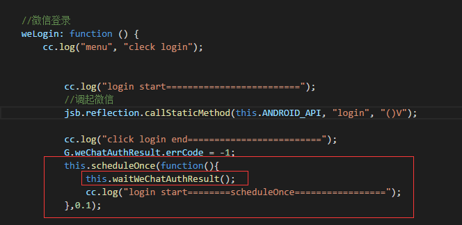 cocos2d-js android点击登录按钮,调起微信授权页面,顺便起一个调度器,一直获取回调结果