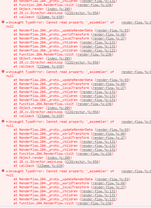 gameThirdScriptError Cannot read property ‘_assembler’ of null;at requestAnimationFrame callback function TypeError: Cannot read property ‘_assembler’ of null at y.203.v._updateRenderData (game.js