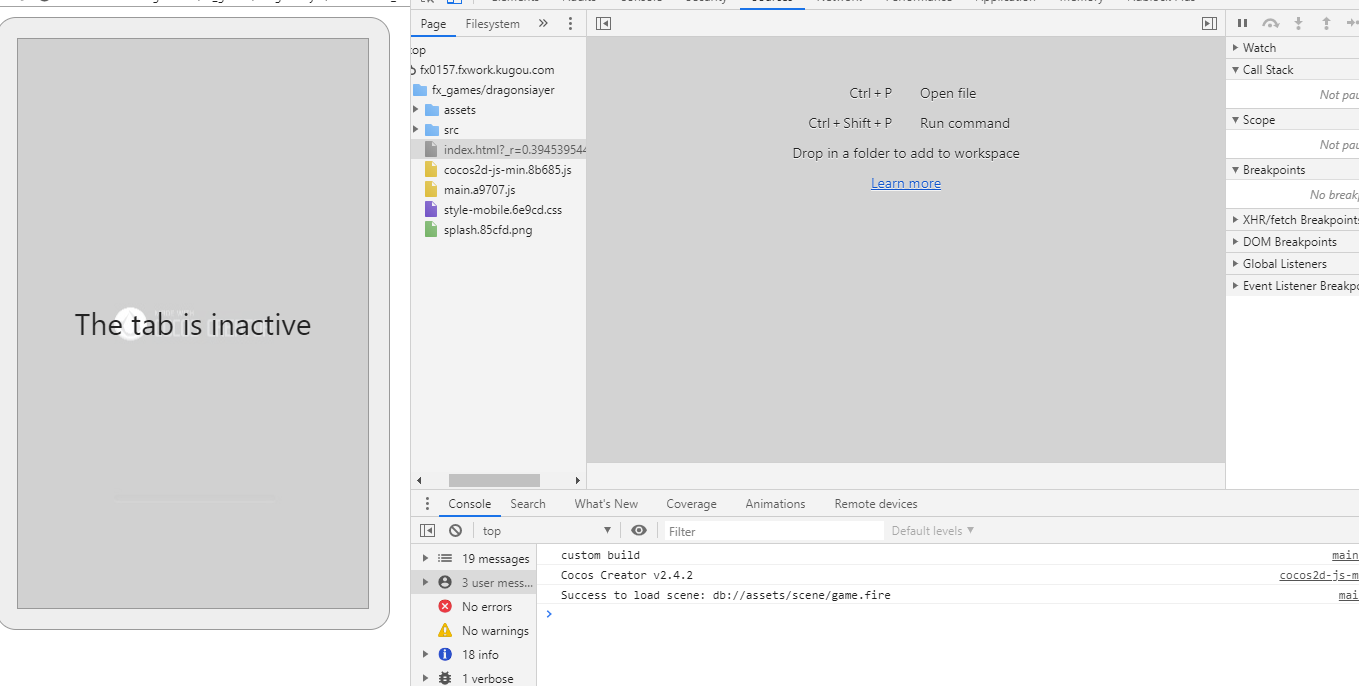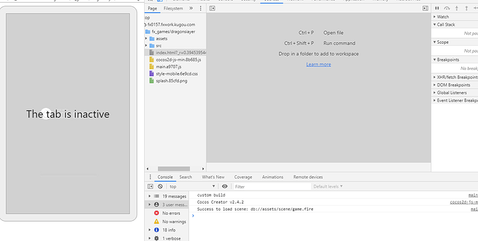 用项目游戏,或者新建一个空包hello world 项目,某APP,ios版本下正常运行,某APP安卓下,debug模式可以正常运行,构建发布后运行在APP的iframe里会出现卡死在loading界面。无报错,感觉像cocos被强行停止了继续渲染,use调试如下图,iframe 的状态很诡异,一直处于inactive状态,如果一步一步断点调试进去,运气好游戏画面会出来,各个逻辑也正常运行…