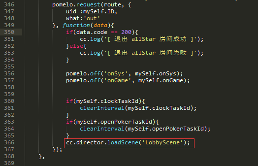 也就是说,由于366行切换场景的代码导致了连接断开,推测可能是由于其长时间未响应,使得websocket心跳停止,导致的连接断开。