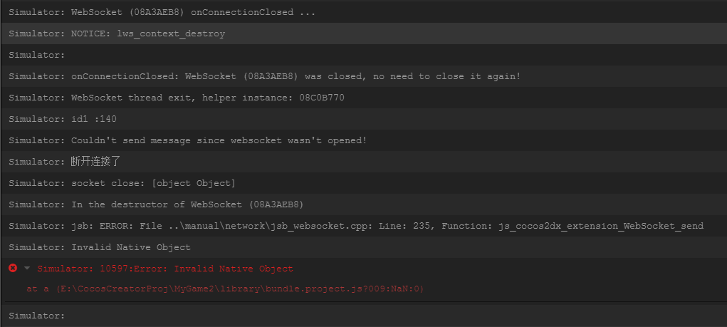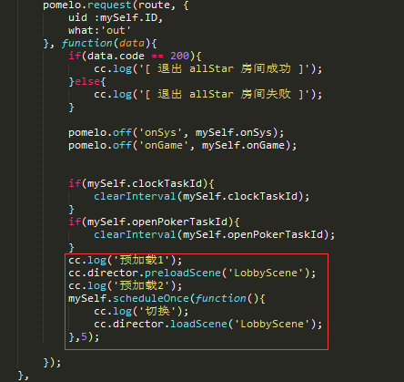 不过不知道为什么websocket会断开。因为切换场景前与服务器之间的相互通信是完全正常的,从pomelo收到回调也能看出来,在执行上面代码中366行时,UI会卡住差不多2、3秒,然后就出现了上面的错误信息。
