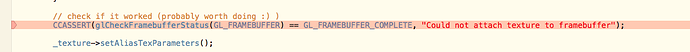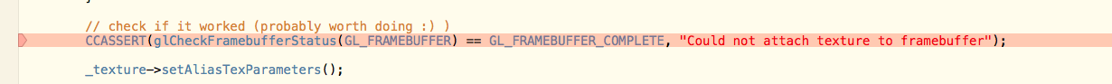 然后就报了错,请高手帮忙解决,另外这个错误只在苹果里出,真机上会闪退,错误代码如下 CCASSERT(glCheckFramebufferStatus(GL_FRAMEBUFFER) == GL_FRAMEBUFFER_COMPLETE, “Could not attach texture to framebuffer”);