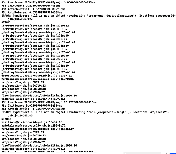 看提示你可以在destroyImmediate方法里面打下断点或者是log,看下是哪一个组件重复被销毁?然后顺着这个线索查下该组件的逻辑