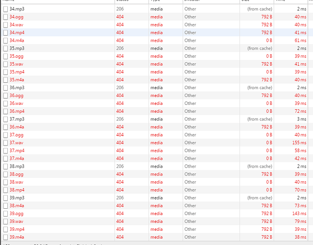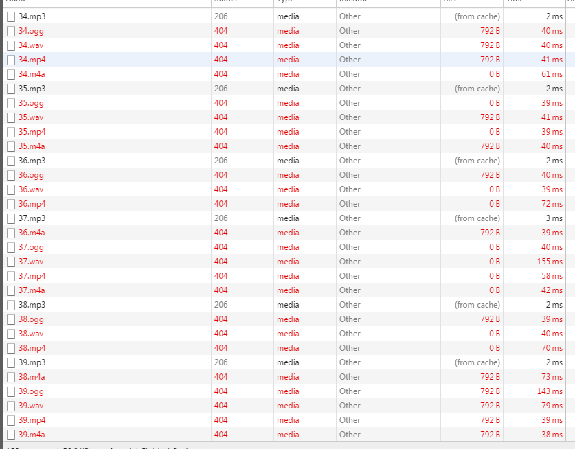 在第二步中,由于加载过程是异步的,我们不能等待一种格式收到 404 再去加载另一种,过慢,所以同时尝试加载,你才会看到加载不同格式的文件,并且有多个 404 返回。