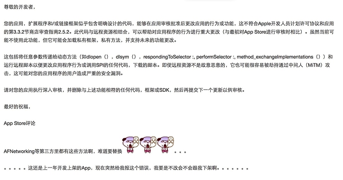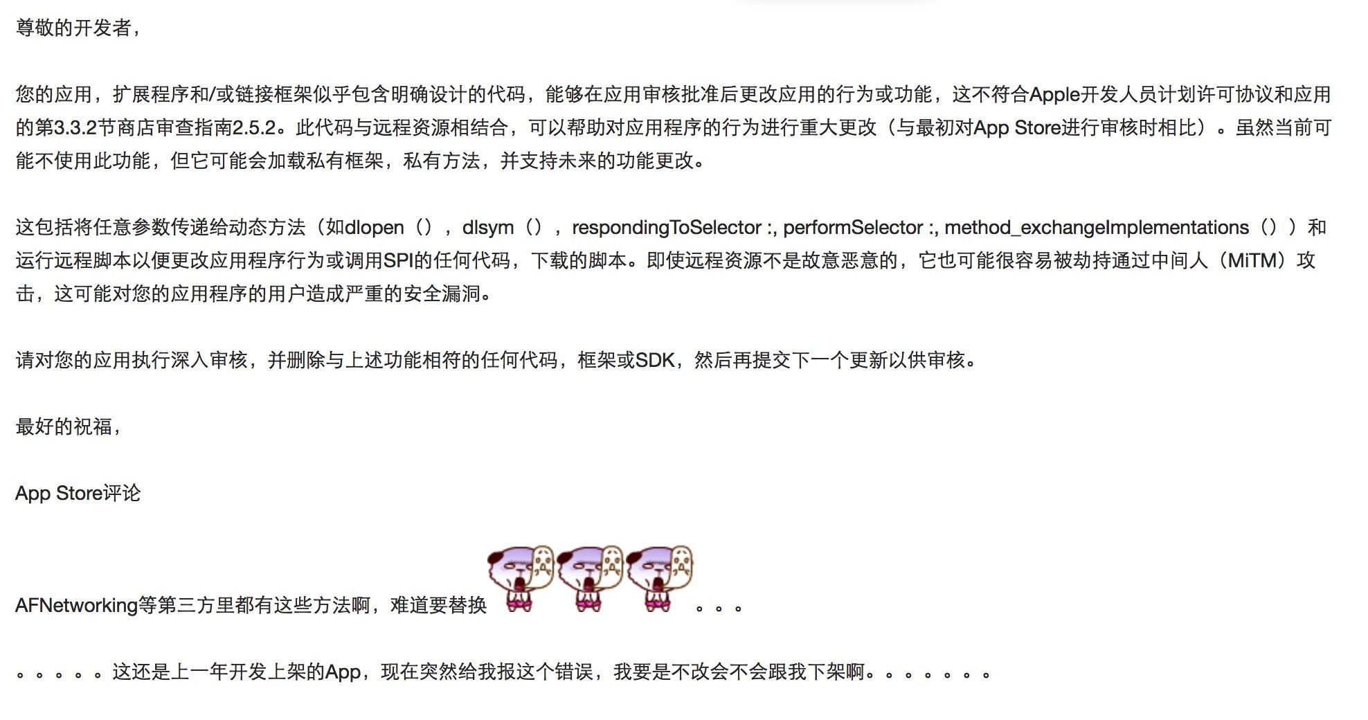 现在还没有明确知道原因。到目前为止,得到的比较靠谱的消息是动态调用objective-c的方法可能会被禁止。比如[xxx performselector: yyy],其中yyy的内容是动态变化的,甚至是网络下载的字符串构成的。