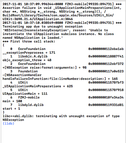 2017-11-01 10:37:10.038549+0800 FZMJ-mobile[99335:894731] *** Terminating app due to uncaught exception ‘NSInternalInconsistencyException’, reason: ‘Unable to instantiate the UIApplication subclass instance. No class named NSApplication is loaded.’