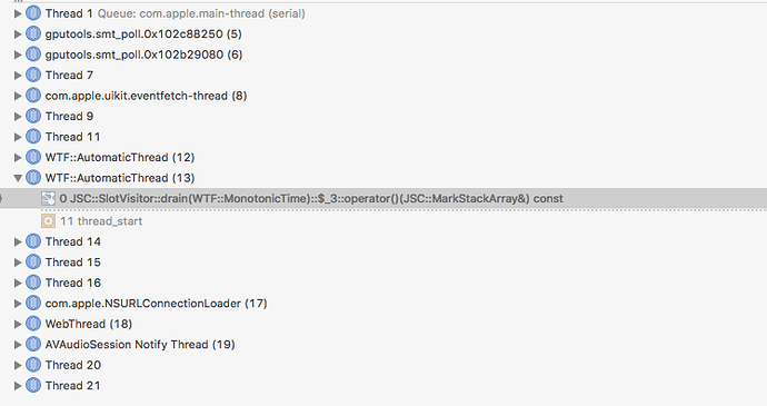 frame #95: 0x00000001967e4010 JavaScriptCoreJSC::JSLock::dropAllLocks(JSC::JSLock::DropAllLocks*) + 188 frame #96: 0x00000001967e4520 JavaScriptCoreJSC::JSLock::DropAllLocks::DropAllLocks(JSC::ExecState*) + 160