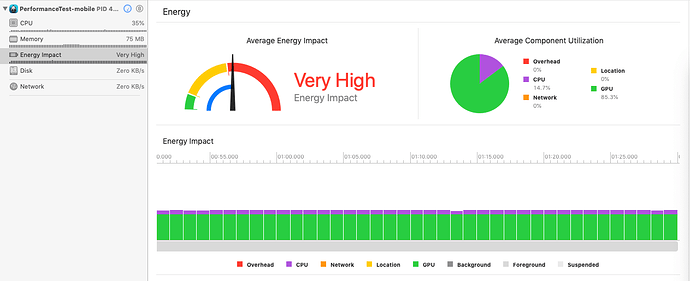 我在一个空场景中加了label用bmfont写了几个字,然后用ios性能查看居然这么高消耗,手机是XS,版本是1.9.3