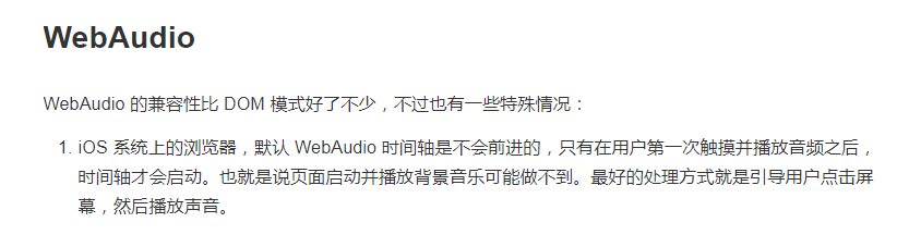 上面说的蛮清楚的,ios的web需要引导触摸萤幕才会拨放音效,所以在我司开发的专案,都是透过引导点击来解决,基本无法克服这问题,因为这个是ios官方提出的而google也跟进了,除非其他大神知道如何绕过这个问题(坐等)