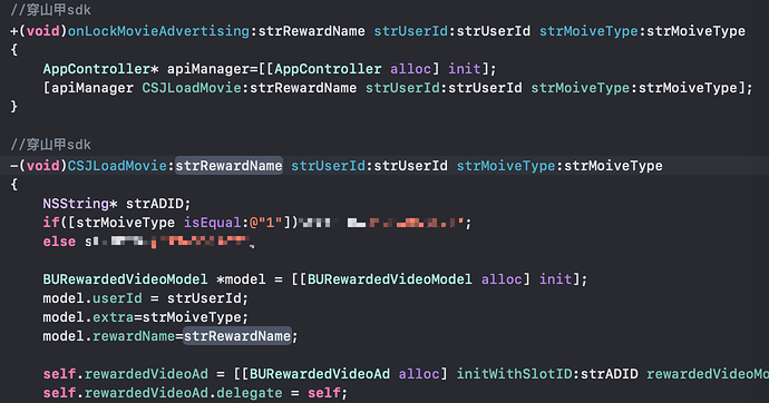 因为js调用oc必须调用oc的类方法,但是穿山甲文档提供的是实例方法,现在需要改动一下让我的js层能调用下面这个方法