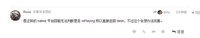 也就是说,如果是原生平台下(安卓,ios,win32),isPlaying返回的都是false,只有在网页下才返回true,不知道这样做是为什么呢?