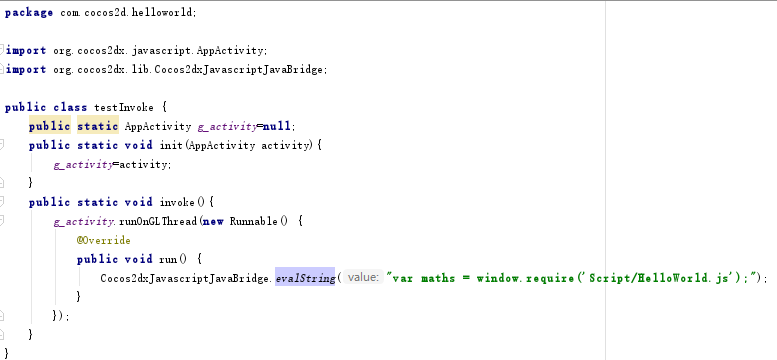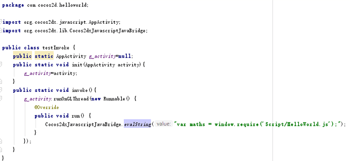 3.发布原生工程以后,在andriod studio中新建testInvoke类,类信息如下。这里我也新建了一个invoke.js并且使用module.exports=invoke导出,报错是一样的,后面我就直接改成HelloWorld还是报错。这里我原先是没有使用路径的,直接require(‘invoke’),没有前面的window,报错是一样的。