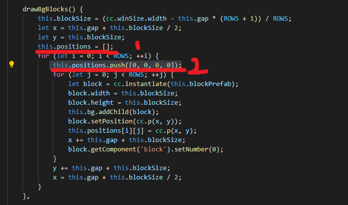 我知道1处的 this.positions = [];是声明的意思,那请问2处的 this.positions.push([0, 0, 0, 0]);代表什么意思呀??是不是还有别的表达方式呢?这段代码是要实现一个四乘以四的方块矩阵,先谢谢论坛的大佬们了!!