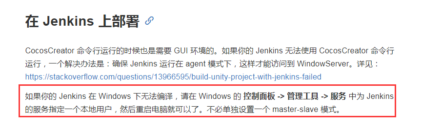 如果你的 Jenkins 无法使用 CocosCreator 命令行运行,一个解决办法是:确保 Jenkins 运行在 agent 模式下,这样才能访问到 WindowServer。