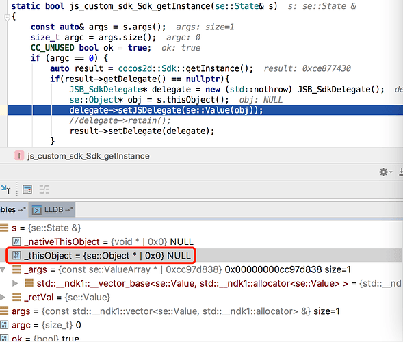 这个s.thisObject() 为啥是null的 这里的 delegate->setJSDelegate(se::Value(obj)) 要如何做?