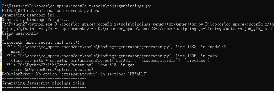 哎,就知道没人回答,我说下解决办法吧。 在引擎路径tools/bindings-generator/generator.py报错行那边改成 userconfig.read(‘D:/cocos/cc_space/cocos2d-x/tools/tojs/userconf.ini’) 要输入userconf.ini的绝对路径。