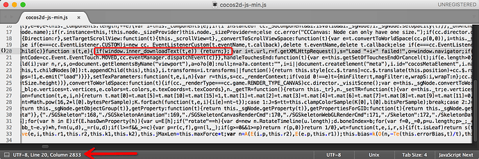 5、修改 cocos2d-js-min.js文件,找到 第20行,第2833列,插入很挫的代码: